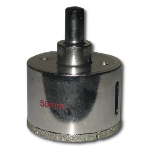 2" (50mm) Diameter, DIAMOND COATED CORE DRILL BIT Description: This diamond coated core drill bit removes a complete circle from glass, tiles, marble, granite, ceramic or other materials and only needs water for lubrication. Can be used with a standard electric Size: 2" (50mm) outside diameter, 3/8" shank, 1-3/8" cutting depth. Always use lubricant (water ), otherwise the diamond core drill will burn. Start your hole diagonally, make a round trace and then hold drill straight.