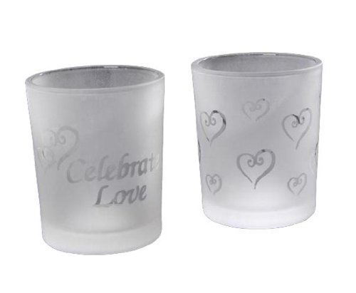 Lovely frosted glass candle holder holds a single tealight. Simple way to light up tables and special corners of the wedding and reception. 2 assorted styles in grouping say either "Devotion, Promise, Cherish" or "Celebrate Love." Sold 24 to a box. Votives not sold singly. Candle holders are 2-1/2-inches high.