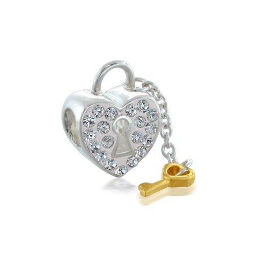 Parisian lovers attach padlocks to the Pont des Arts and throw the key into the Seine. Buy our sterling silver crystal charm and just slip on the heart lock charm to your Pandora compatible bracelet. You will not want to part with this glittering little heart lock bead. Its hard to find such appealing cheap silver jewelry on the market. This sparkling, Swarovski crystal sprinkled heart bead is completely compatible with Pandora bracelets and Pandora charms. Our gorgeous silver bead with the tiny dangling gold key is the perfect gift for Mothers Day, birthdays, Valentines Day, weddings, baby sh