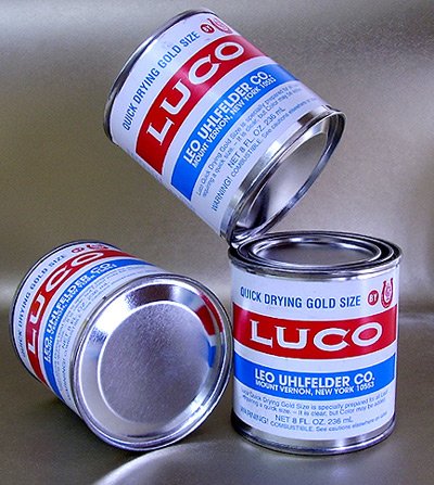 Luco Gold Size...We offer two high quality gold sizes from Luco. The Luco Slow Set Gold Size - This size is a Gilder's Oil designed for all leaf work where extended tack time is allowed greater brilliance is desired and a clear protective top coat is not necessary. Luco Slow Set Gilder's Oil will be ready for gilding in 10 to 12 hours depending upon temperature and humidity. This tack will hold up to 24 hours.Luco Quick Dry Gold Size - This size is a clear gilder's varnish designed for fast leaf work. it may also be used as a clear protective top coat over leaf lettering and other decorative w